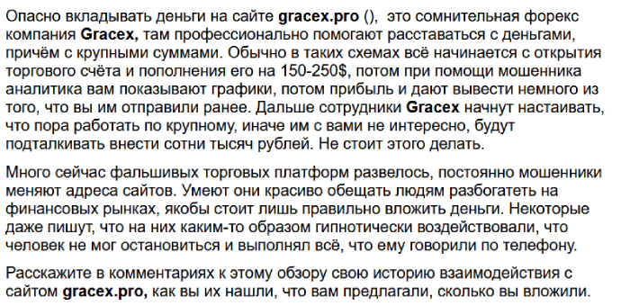 Поскольку наши нынешние герои являются типичными мошенниками, отзывы о Gracex являются негативными. Именно такие комментарии были ожидаемыми и прогнозируемыми, ведь перед нами типичный лохотрон. Данный нелицензированный проект, скрывающий важную информацию о себе и своей работе, однозначно отправляется в черный список.