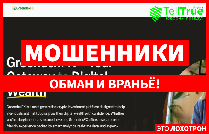 Очередной мошеннический брокер вышел на арену обмана и кидалова клиентов с лозунгом «GreendexFX — ваш путь к цифровому богатству.». Мошенники GreendexFX (greendexfx.org) называют себя проверенным криптовалютным брокером нового поколения, предлагают эффективную торговлю цифровыми активами клиентам и, просто обманывают их, так что стоит быть внимательнее. Этот брокер не поможет заработать деньги, а вот слить депозит может быстро и успешно.