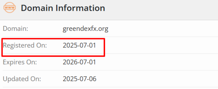 - период работы компании – конкретные данные на сайте не указаны, а сам ресурс был зарегистрирован 17 дней назад (https://www.whois.com/whois/greendexfx.org);