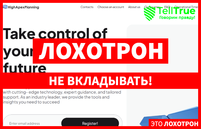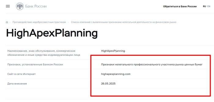 Примером брокера, что пытается уверять клиентов в легальности и законности своей работы, приглашает на якобы лучший торговый терминал, а на самом деле грабит, является лохотрон HighApexPlanning. Данную платформу продвигают, как брокера надежного и проверенного, клиентам рассказывают, что они при сотрудничестве будут получать приличные деньги, а в самом деле, цинично обманывают и кидают.