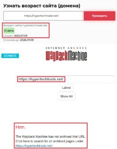 Проверим: кто они такие на самом деле? Сервис Whois (https://who.is/whois/hypertechtrade.net), где можно посмотреть дату регистрации домена, показывает — сайт создан 9 июля 2025 года. Впечатляющее «многолетнее присутствие» оказалось выдумкой. Никакой истории деятельности. Заходим в Веб-Архив (https://web.archive.org/web/20250000000000*/https://hypertechtrade.net/) — ресурс, сохраняющий копии сайтов. Ничего не находим: значит, проект собран с нуля и появился на свет совсем недавно.
