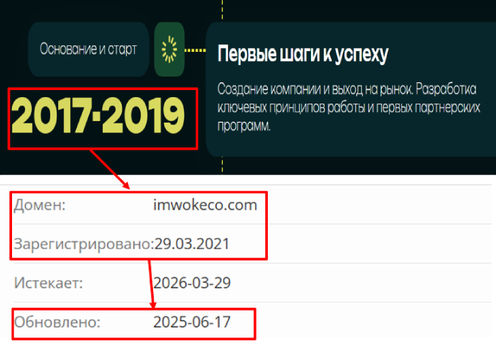 - период запуска работы компании – пишут, что брокер был основан в 2017 году, а проверка истории сайта показывает, что его зарегистрировали в 2021 году, а купили наши герои домен буквально месяц назад (https://www.whois.com/whois/imwokeco.com);