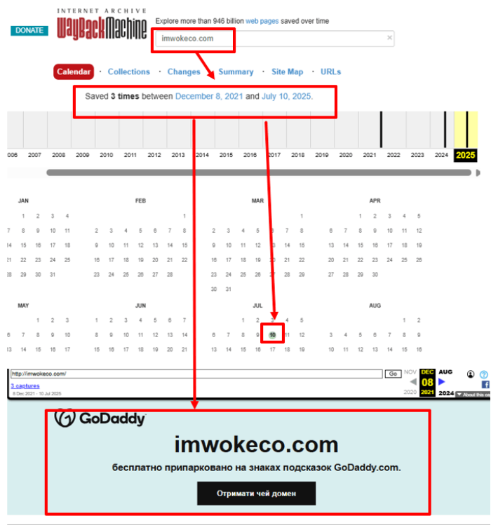 Дополнительно мы посмотрели данные по сайту через Веб Архив (https://web.archive.org/web/20250000000000*/imwokeco.com). Это показало, что домен после создания был выставлен на продажу и буквально месяц назад наши герои, выкупив его, запустили своего примитивного брокера.