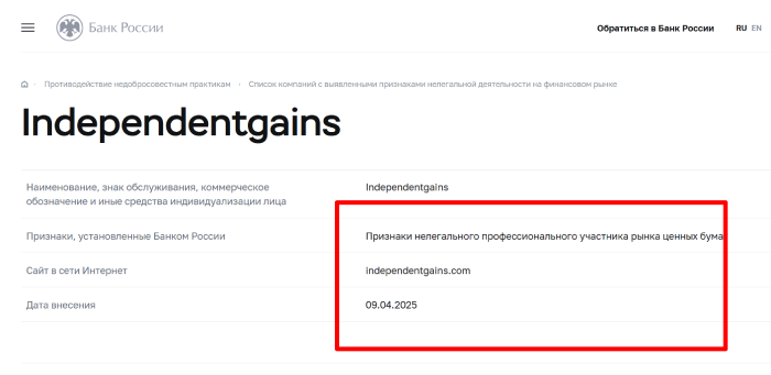 Клиенты, что доверились представителям организации, из-за нее потеряли крупные суммы. Вернуть от таких жуликов финансы крайне сложно и, это факт, так что связываться с ними опасно для трейдеров. Поскольку организация обманывает, то и отзывы Independentgains уже свои первые получает, а окрас их полностью негативный.