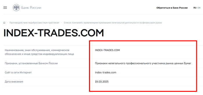 INDEX-TRADES.COM является примером шаблонной брокерской организации. Эта площадка была создана мошенниками практически почти 3 месяца назад. Но ее выдают за надежного биржевика, что помогает клиентам зарабатывать на финансовых рынках и этому верить не стоит.
