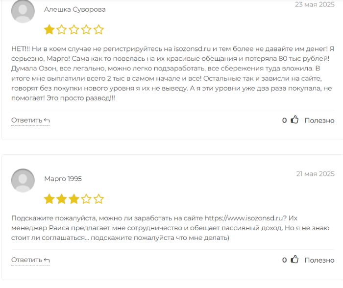 Что касается реальных отзывов об Isozonsd и работе с проектом, то реальные люди уже массово пишут об организации негатив, что и разрешает догадаться об ее истинных намереньях по отношению к клиентам. Именно поэтому данный проект не стоит воспринимать, как пространство для заработка, его нужно обойти стороной.