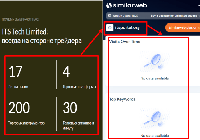 Дополнительно мы изучали историю этого брокера через Веб Архив (https://web.archive.org/web/20020601000000*/itsportal.org) и убедились, что этот проект молодой. По сути, сайт даже месяца не просуществовал, а его пытаются выдавать за надежного брокера.