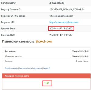 А теперь обратимся к фактам. JHC-wcb громко заявляет, что работает с 2017 года и имеет огромный опыт в сфере инвестиций. Но если проверить домен, то окажется, что сайт был зарегистрирован 14 сентября 2023 года, но активное использование началось с момента обновления 27 января 2025, а это значит, что площадке нет и года. Очевидно, что вся информация о многолетней деятельности — не более чем выдумка. Да и стоимость этого лохотрона в один рубль ничтожно мала.