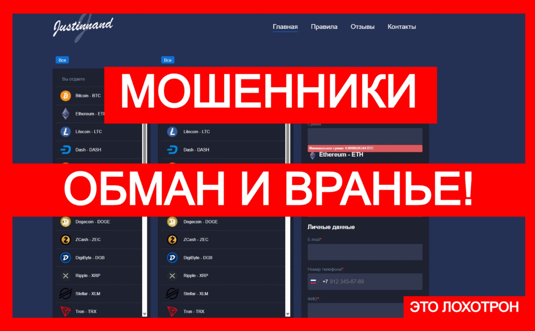 Вы хоть раз видели Justinnand среди крупных обменников в BestChange? Нет? Мы тоже не нашли. А это, между прочим, тревожный звоночек. Если такая “прибыльная” компания всерьез работает в индустрии — почему о ней никто не говорит, почему ни один легальный ресурс не берется включить ее в списки? Ответ один: все это — фальшивка. Площадка просто не имеет права распоряжаться вашими средствами, и уж тем более не предоставляет ничего легального.
