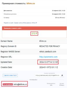 А теперь давайте немного о цифрах. Домен зарегистрирован в середине января 2024 года, но активная деятельность началась только с 27 декабря 2024, когда аферисты выкупили сайт. Такая вот манипуляция — дешевая, но, надо признать, порой работает. Особенно если человек отчаянный, растерянный и хочет просто вернуть свое. Добавьте сюда еще и мизерную стоимость в 272 рубля, что ничтожно мало для легальной компании.