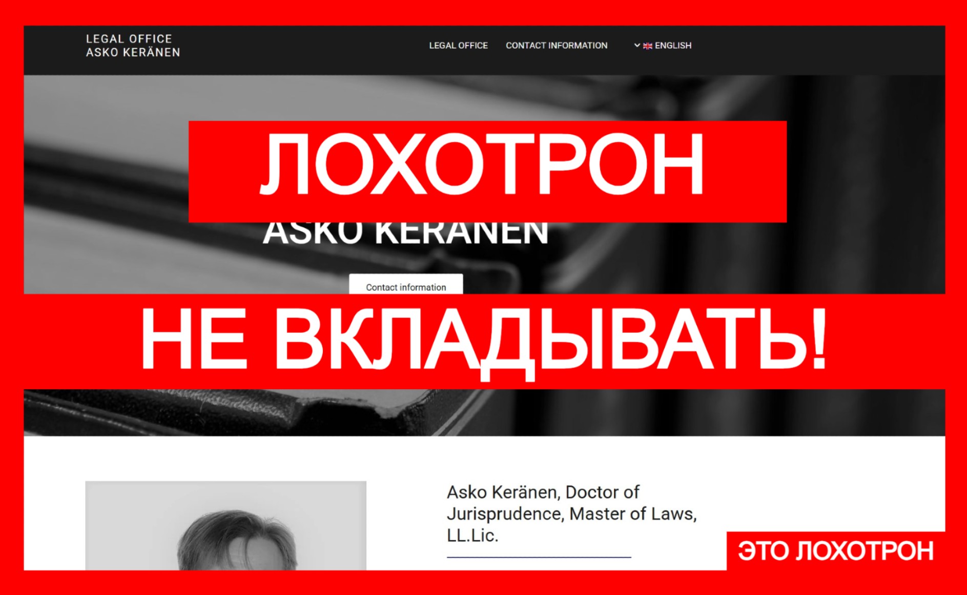 Мы изучили деятельность Legal Office Asko Keränen — и картина, мягко говоря, удручающая. Сайт askokeranen.fi? Стандартный шаблон, слепленный на скорую руку. Это уже стало классикой среди аферистов: зачем заморачиваться с дизайном, если можно просто стянуть макет у таких же, изменить логотип и вперед — собирать новые жертвы? Все, что там размещено — пустота. Одни общие фразы, никакой конкретики, никаких объяснений.