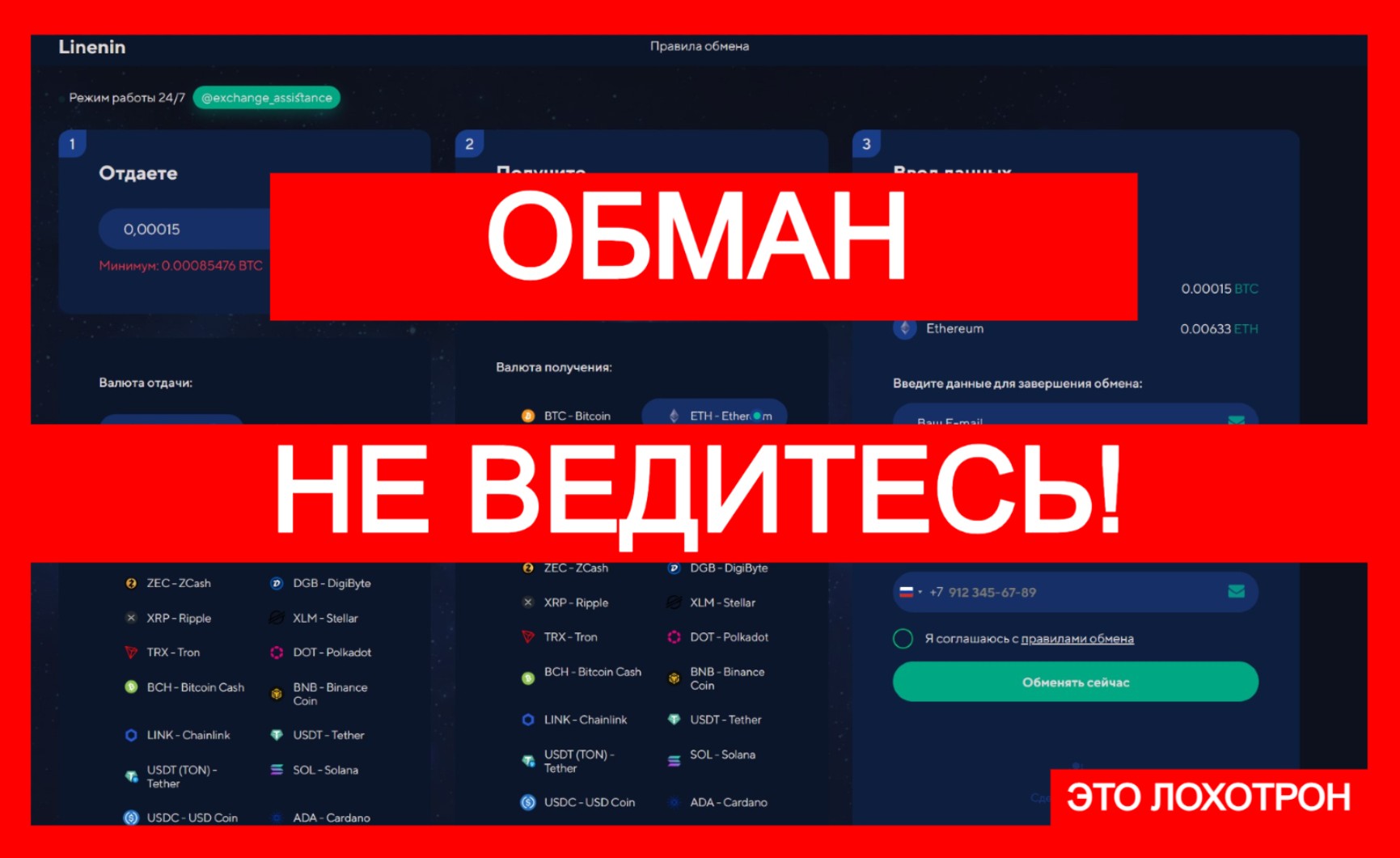 Перед нами — очередной “молодой и амбициозный” обменник, за фасадом которого скрываются все те же приемы старых-добрых мошенников. linenin.com — якобы платформа для мгновенной конвертации криптовалют. Тут вам и арбитраж, и завышенные курсы, и моментальные сделки. Но, давайте честно, если бы все было так просто, разве бы кто-то еще работал на зарплату?