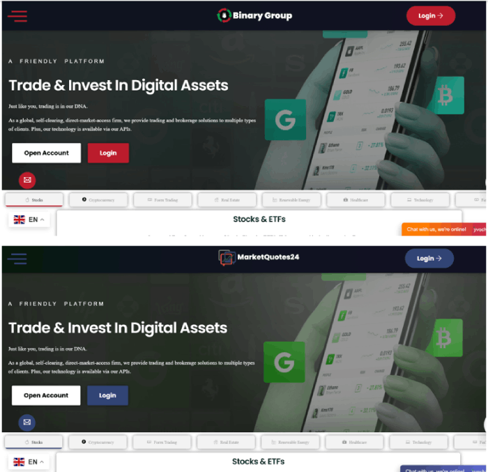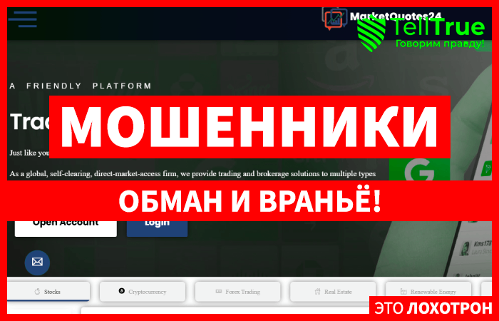 Примером мошеннической организации, что нагло кидает простых людей и выманивает средства с населения, является платформа MarketQuotes24. Данный проект был создан менее месяца назад, а по дизайну он такой же, как сайт Binarystockgroupfirm, что уже говорит о создании лохотронов одними и теми же мошенниками.