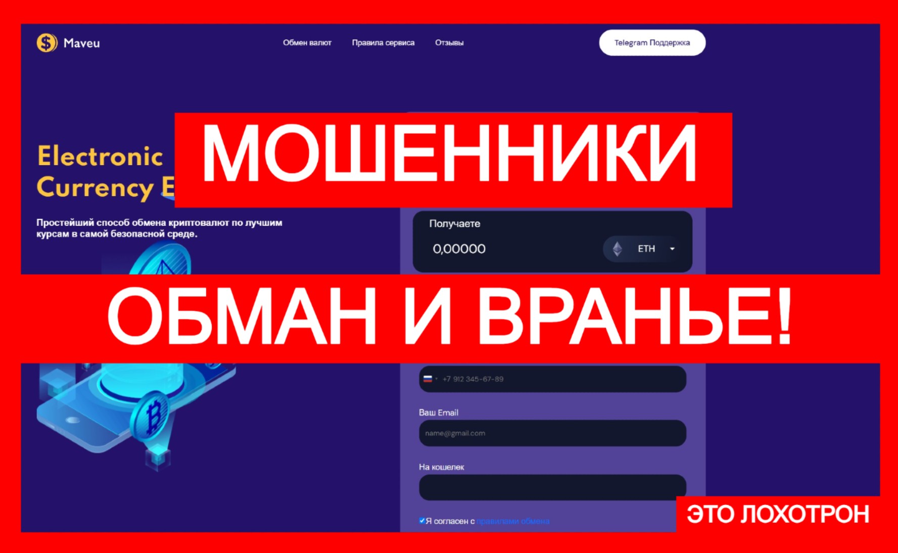 Сайт maveu.com выполнен, мягко говоря, на скорую руку. Все словно взято из одного и того же конструктора, которым уже пользовались десятки других мошеннических ресурсов. Оформление скучное, интерфейс — типичный шаблон. Если честно, у нас сложилось впечатление, что кто-то просто заменил логотип, добавил пару строк текста — и вот, «новый» проект готов к работе. Или, точнее, к обману. Это даже не наша догадка — такие случаи уже описывались в сети, и неоднократно. В отзывах люди жалуются на одно и то же: деньги отправлены, обмен не завершен, поддержки нет. Знакомо?