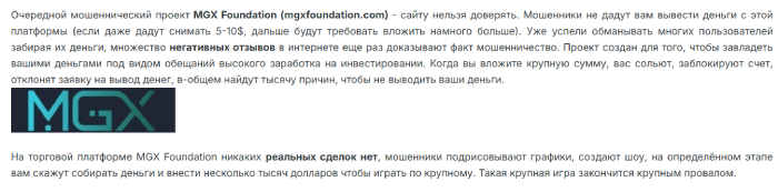 И действительно, вывода средств с MGX foundation не существует, да и не разрешают его провести многочисленные подвохи, прописанные в правилах компании. И это в очередной раз доказывает, что перед нами наглые мошенники, обманывающие простое население. Таких проектов с каждым днем становится только больше, соответственно стоит стать осторожнее, не связываясь с ними.