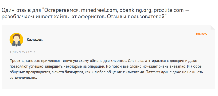 Что касается реальных отзывов о MineDreel и работе проекта, то негативных комментариев с каждым днем становится только больше. Именно поэтому стоит стать осторожнее при выборе биржевиков, четко понимая, что наглых мошенников очень много и, работать с ними не стоит. Мошенников намного больше, чем брокерских компаний надежных и проверенных, так что стоит быть осторожнее.