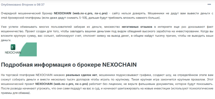 Если найти и внимательно прочесть отзывы о Nexochain, оставленные реальными клиентами проекта, то еще раз можно понять, что перед нами мошенническая организация и, она обманывает простых людей. Понимая данный факт, от мошенников стоит держаться, как можно дальше, ведь работа с нелицензированными лохотронами к хорошим результатам не приводит.