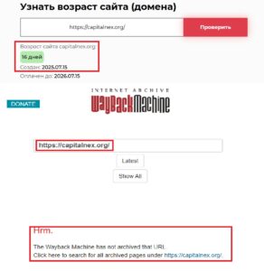 Если копнуть чуть глубже, картина проясняется. Сначала — проверка через Whois (https://who.is/whois/capitalnex.org): домен зарегистрирован лишь 16 дней назад. При этом на сайте говорится о «долгих годах успешной работы». Откровенный обман, ведь даже Веб-Архив (https://web.archive.org/web/2/https://capitalnex.org/) не содержит ни одной архивной копии сайта ранее этой даты. То есть проект попросту не существовал.