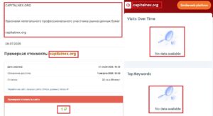 Дальше — Seolik, сервис оценки сайтов. Согласно его данным, стоимость capitalnex.org не превышает 1 рубля. Для серьезной компании это просто смешно. А вот SimilarWeb, аналитика трафика, показывает — на сайте почти никто не бывает. То есть ни клиентов, ни активной работы — нет.