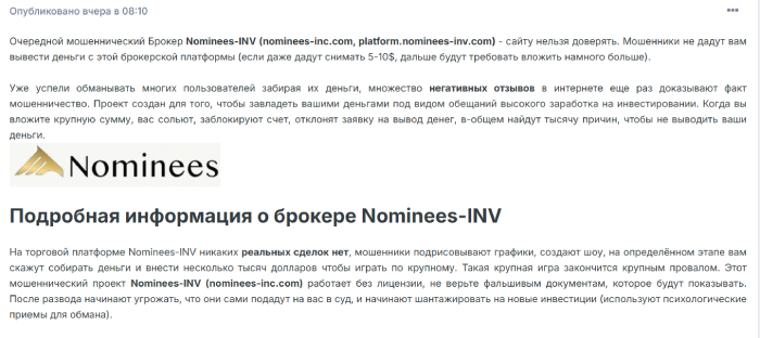 Отзывы о Nominees INV тоже негативные и, это еще раз доказывает, что перед нами мошеннический проект, занимающийся обманом простых людей. Таких аферистов с каждым днем становится все больше, так что нужно быть внимательнее и не попадать на кидалово, иначе есть риск остаться полностью с пустыми карманами.