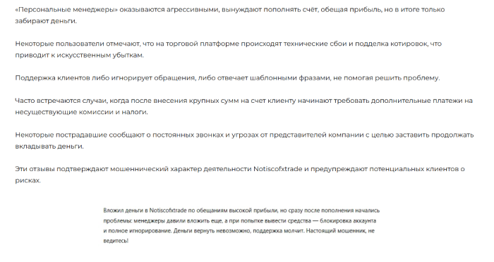 Человек видит торговые процессы на терминале мошенников, ему даже рисуют какой-то небольшой профит, а по факту, грабят и перестают выходить на связь. Нельзя вывести средства с Notiscofxtrade, ведь такой опции тут не предусмотрено. Перед нами аферисты, что кидают население и делают это очень активно, соответственно и работать с ними не стоит.