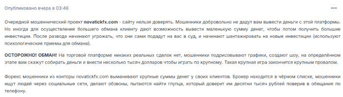 Что касается отзывов о Novatickfx, то они являются негативными на просторах интернета и, это полностью заслуженно. Эти мошенники работают только на прием финансов и являются нелегальной кухней, соответственно сотрудничество с ними не может привести ни к чему положительному, в чем многие люди убедились на своем опыте.