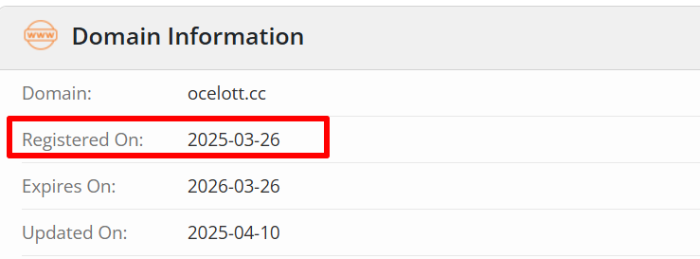 - информация о периоде работы брокера – согласно данных официального сайта компании, работать она начала в 2017 году, проверка домена (https://www.whois.com/whois/ocelott.cc) показывает, что ресурс был зарегистрирован 26 марта 2025 года;