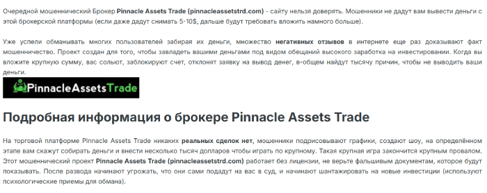 Читая реальные отзывы о Pinnacle Assets Trade и работе данного проекта, лишний раз можно только убедиться в том, что перед нами наглые мошенники и, они обманывают обычное население. Этот проект настроен исключительно на прием клиентских финансов, соответственно работать с ним категорически нельзя, да бы не остаться с пустыми карманами.