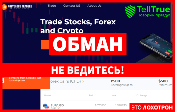 Примером типичного мошенника, что выдает себя за престижного и проверенного брокера, при этом обманывает население, является организация Polyglobetraders. Этот недавно созданный проект продвигают в сети очень активно и, рекламируют, как компанию со стажем, а также многочисленными наградами. Все это выглядит вкусно и красиво, но на самом деле отношения к реальности не имеет.