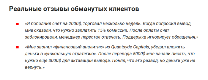 Отзывы о Quantsyde Capitals в интернете оставляют негативные, что еще раз подтверждает истинные мошеннические намеренья компании и ее желание присвоить чужие средства. Таких мошенников с каждым днем появляется все больше и, они активно занимаются обманом, так что трейдерам стоит стать максимально осторожными и внимательными.