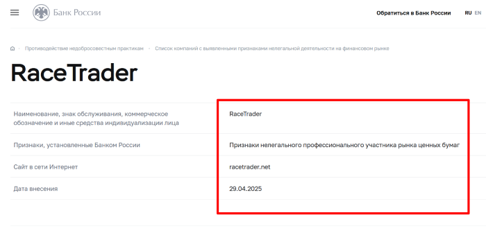 Когда пользователям не удается вывести средства с RaceTrader, они понимают, что жулики кинули, но уже поздно. Перед нами типичная кухня, что даже правила подстроила под себя и, она не соответствует требованиям финансового регулятора. Именно поэтому Центробанк добавил проект в черный список и, с ним связываться нельзя.