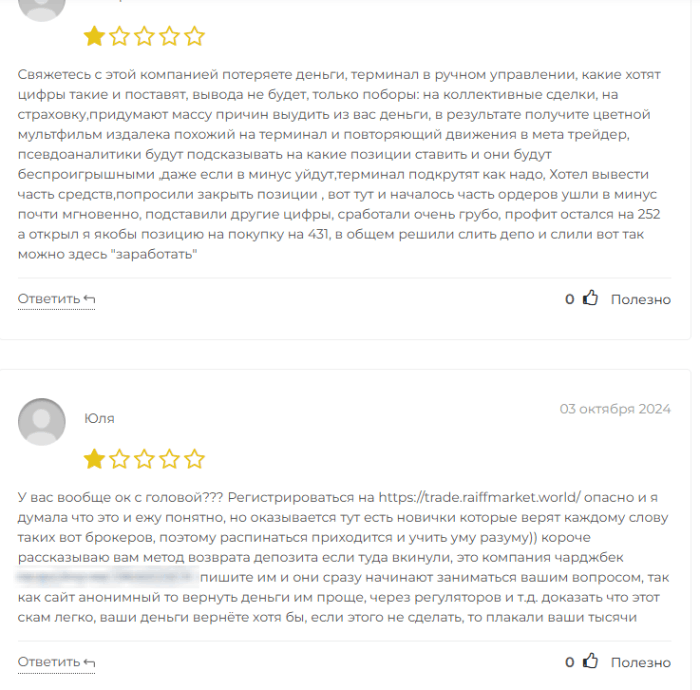 Понимая данный факт нужно внимательно проверять каждого брокера, чтобы не попасть на обман и не потерять свои финансы. О Raiffmarket отзывы в сети только негативные. И каких-то других комментариев тут ожидают, не следовало. Перед нами наглые мошенники, что обманывают и кидают на деньги простых людей. Соответственно, работать с ними категорически не стоит.