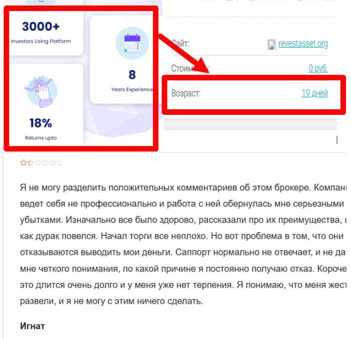 Брокер Revest Asset – пример шарлатанского проекта, созданного для кидалова простого населения. Перед нами типичная мошенническая организация, что выдает себя за надежную и проверенную компанию, банально обманывая простое население. Аферисты нарисовали красивую статистику, уверяя людей, что они проверенный биржевик, вместе с тем, мошенники создали свой лохотрон 18 дней назад и, это первый признак кидалова.