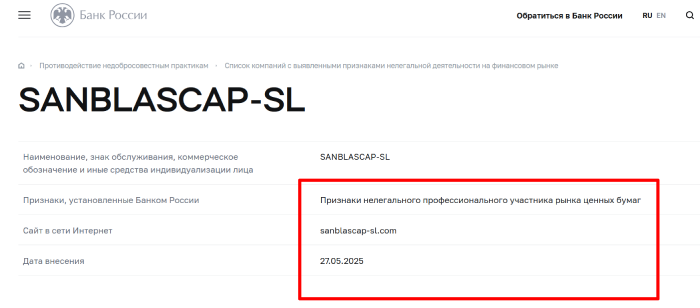 Одним из факторов, подтверждающих нелегальность организации и кидалово с ее стороны, назвать можно внесение проекта в черный список Центробанка. Если проект попал в немилость финансового регулятора, то и сотрудничество с ним не будет хорошим решением. Вывести средства с SANBLASCAP-SL невозможно и, это факт.