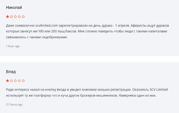 Реальные отзывы о SCV Limited тоже оставляют негативные и, они говорят о том, что мошенническая организация не заслуживает даже минимального внимания. Перед нами типичный лохотрон, обманывающий простых людей и, связываться с ним не стоит. именно поэтому мошенническую организацию и нужно обходить стороной, да бы не потерять из-за нее финансы.