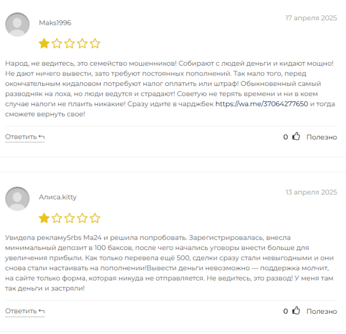 Все красивые картинки аферистов – это только циничный обман и, вестись на него однозначно не стоит. Что касается реальных отзывов о Srbs-ma24, то они негативные и, это факт. Таких комментариев данный проект и заслуживает, ведь его создали мошенники для выманивания средств.