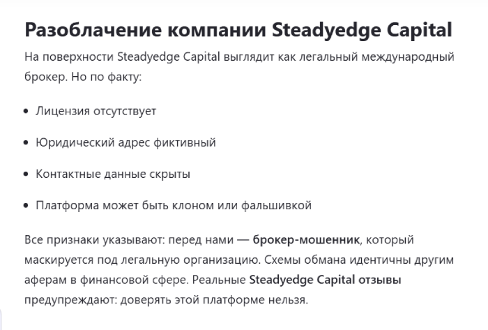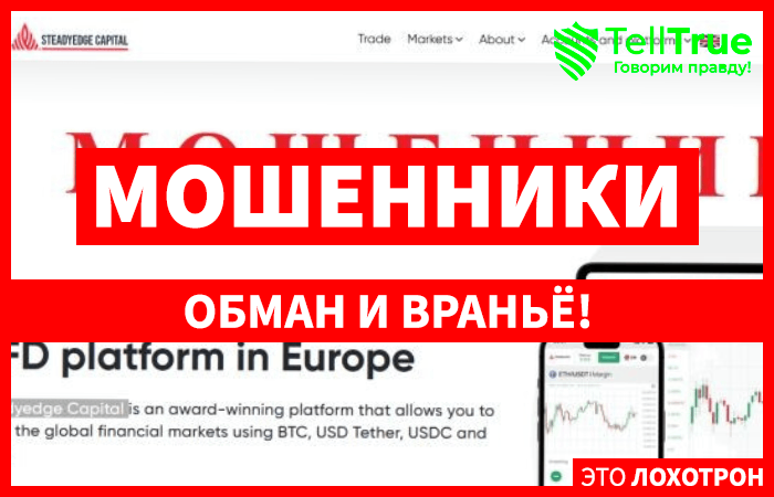 Проект с названием Steadyedge – пример типичного брокера мошенника, что обманывает простых людей и нагло кидает их на деньги. данная площадка является достаточно молодой, но ее выдают за надежную и проверенную компанию с пропиской, лицензированием, чему верить точно не стоит.