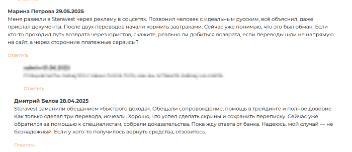 Настоящие отзывы о STERAVEST являются негативными и, именно поэтому стоит быть осторожнее и внимательнее. Проверять брокеров стоит до момента сотрудничества с ними, а не по факту потери у мошенников финансов. Как правило, залить мошенникам средства на терминал можно, а вывести уже нет, так что стоит быть осторожнее. лжеброкерские компании сейчас очень хитрые и это факт.