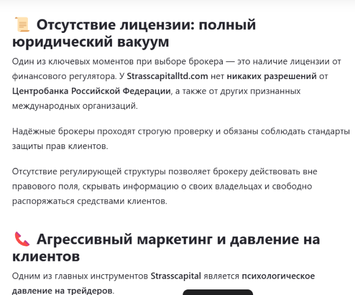 Именно поэтому работать с данным проектом категорически не стоит, ведь обман с его стороны гарантирован. Отзывы о Strass Capital только подтверждают факт того, что организация не заслуживает никакого внимания. Если пользователи будут с ней работать, то финансы свои они потеряют быстро и успешно. Понимая данный факт, а еще то, что компания не лицензируется, ее стоит обойти стороной.