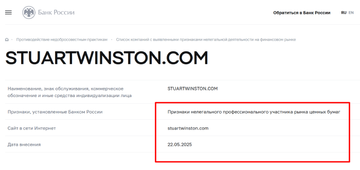 Читая реальные отзывы о STUARTWINSTON.COM, стоит сказать о том, что перед нами мошенники и, они обманывают простых людей. Такие проекты работают только на присваивание финансов и, с ними взаимодействие всегда имеет максимально негативные последствия, так что стоит быть осторожнее, не попадаясь на кидалово.