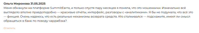 Подобные брокерские проекты делаются пачками и, активно продвигаются в интернете, а все только ради того, чтобы оставить пользователей с пустыми карманами. реальные отзывы о SummitEarns и деяниях этого лохотрона являются негативными, что было вполне прогнозируемым. Перед нами типичные мошенники, нагло обманывающие клиентов и, с ними работать не стоит.