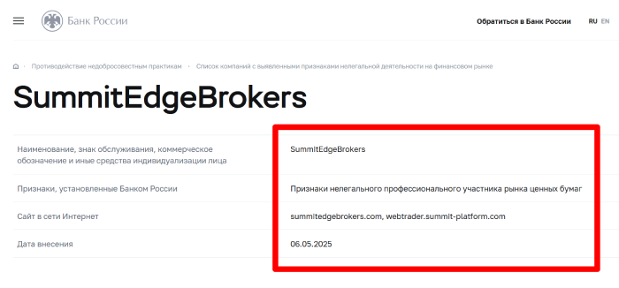 Примером фальшивого брокера, что обманывает обычное население, является организация SummitEdgeBrokers. Реальный период работы этой организации является очень малым, а ее пытаются выдавать за инновационный, проверенный проект, чему верить нельзя. нет на сайте конкретных данных о легальности проекта, его собственниках, структуре собственности и месте расположения офиса.