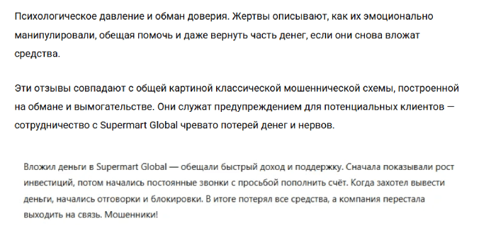 Отзывы о Supermart Global Plc и работе проекта тоже выставляют на просторах сети чисто негативные и, этого следовало ожидать. Перед нами очередные типичные мошенники, что работают для кидалова и просто выманивают средства с населения. И таких проектов есть очень много, так что стоит быть осторожнее, не попадая на кидалово. Доверяя лжеброкерским компаниям свои средства, пользователи не получат никакого дохода, а просто останутся с пустыми карманами и потеряют свои финансы, так что выбирать брокеров стоит ответственно.