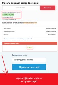 Еще один интересный момент — возраст сайта. Всего 2 месяца и 20 дней. Настоящие брокеры годами работают над своей репутацией, а здесь… Видимо, авторы проекта сами понимают, что их схема долго не протянет. Тем более что сам сайт стоит всего лишь 130 рублей, что однозначно не вызывает доверия. Обратная связь? Контакты? Ну, технически есть электронная почта support@swiss-coin.co, куда можно написать сообщение, но ответа ждать бессмысленно.