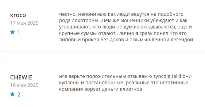 Что касается реальных отзывов о Sync Digital, то они являются негативными и, таких комментариев проект полностью заслужил. Организаторы этого лохотрона цинично грабят простых людей, а значит, с ними связываться категорически не стоит, поскольку такое сотрудничество ничем хорошим закончиться не может. Многие люди на своем негативном опыте убедились, что это лжеброкер и, его стоит обходить стороной, чтобы не попасть на обман аферистов.