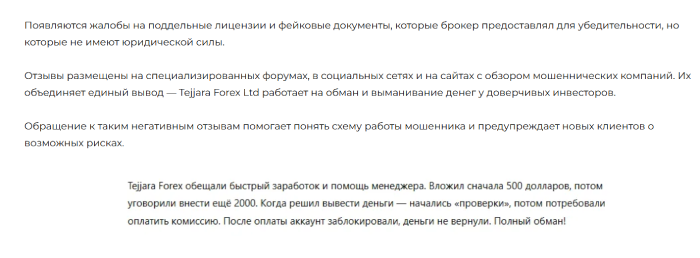 Отзывы о Tejjara Forex Ltd тоже в сети встречаются только негативные и, это было ожидаемым. Перед нами мошеннический проект, что занимается наглым обманом, кидая простых людей. Такие лохотроны в сети появляются достаточно часто, а их представители банально обманывают простое население.