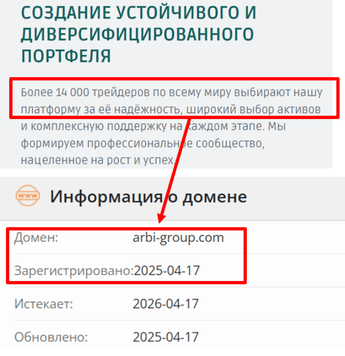 - период существования организации и предоставления брокером услуг – конкретной даты основания компании не указывают, а сайт ее был запушен в апреле 2025 года (https://www.whois.com/whois/arbi-group.com);