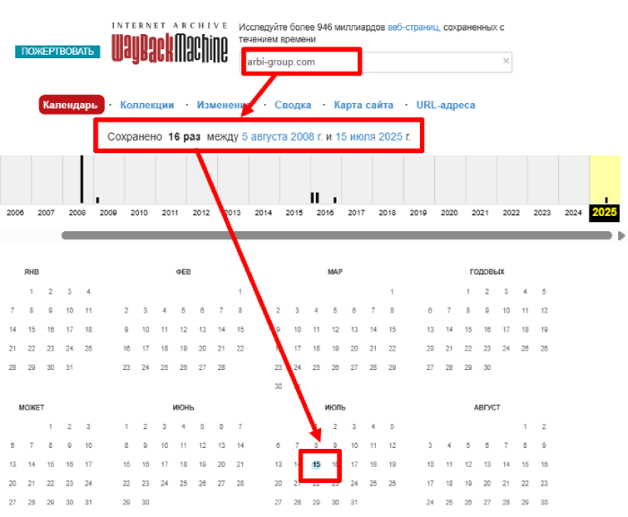Также мы смотрели историю сайта через Веб Архив (https://web.archive.org/web/20250000000000*/arbi-group.com). Увидели факт того, что только в июле 2025 года сайт начал работать в том формате и дизайне, который пользователям предлагает. Это еще раз говорит, что перед нами молодой лохотрон, заинтересованный в чужих средствах.