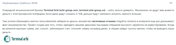 Часто бывает так, что фальшивые брокеры пытаются работать на широкую аудиторию, заявляя, что у них есть и инвестиции, и предложения для трейдеров. Один с таких примитивных лохотронов пишет на своем официальном сайте «Комплексный инвестиционный подход: анализ, стратегия, результаты», обманывая простое население в широком формате. Хоть брокер Arbi (arbi-group.com) пытается изображать продвинутого профессионала, с ним не стоит иметь ничего общего, что доказывают реальные факты, так что предложения компании лучше проигнорировать.