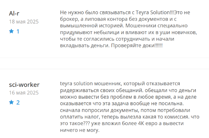 Перед нами мошенники и они обманывают простых людей, так что работать с подобными шарлатанскими компаниями однозначно нельзя. отзывы о Teyra Solution только подтверждают факт того, что с данным проектом ничего общего иметь нельзя и, от него стоит держаться подальше.
